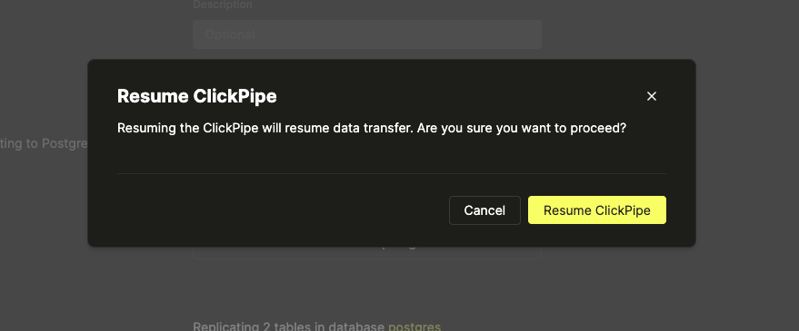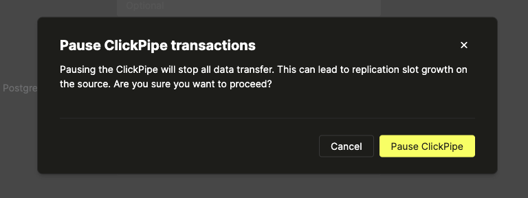 Есть сценарии, когда может быть полезно приостановить MySQL ClickPipe. Например, вы можете захотеть провести аналитику по существующим данным в статическом состоянии. Или вы можете выполнять обновления MySQL. Вот как вы можете приостановить и возобновить MySQL ClickPipe.